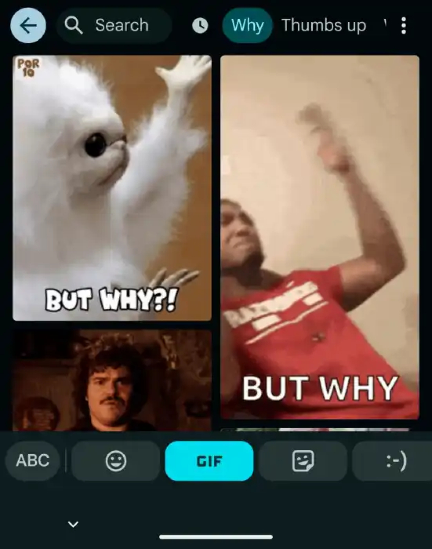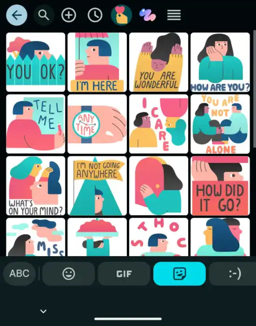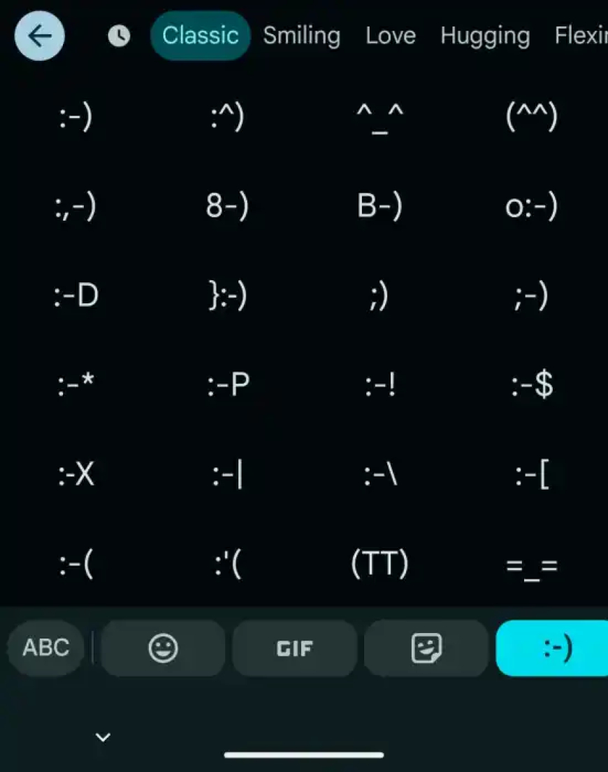 Tại khu vực cuối màn hình, các nút chức năng như emoji, GIF, sticker và emoticon giờ đây được đặt trong các hình chữ nhật bo tròn, đồng nhất với phong cách thiết kế của các công cụ và phím tắt khác trên bàn phím. (Thứ tự của các nút này cũng đã được sắp xếp lại.) Khu vực này hoạt động như một dải cuộn ngang (carousel), cho phép người dùng dễ dàng lướt qua các tùy chọn (có thể có phần bị khuất). Song song đó, nút chuyển đổi sang bàn phím ký tự ("ABC") có hình dạng viên thuốc, và phím xóa ban đầu ở ngoài cùng bên phải đã được gỡ bỏ. Cập nhật: Về phím xóa, nó đã được thay thế bằng một nút hành động nổi (FAB) khá rõ ràng, chỉ xuất hiện khi có văn bản được nhập.